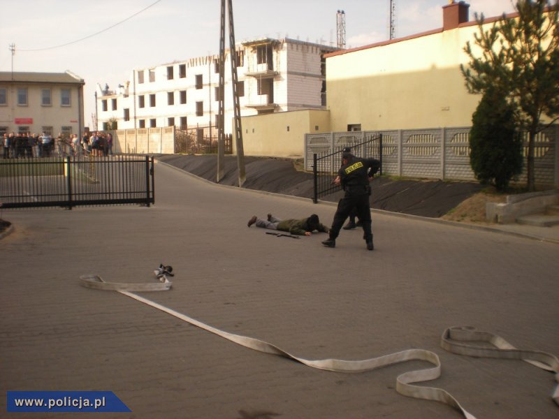 Wczoraj (4.10) dyżurny rypińskiej komendy otrzymał telefoniczne zgłoszenie o podłożonym ładunku wybuchowym w budynku starostwa powiatowego. Natychmiast na miejsce skierował wszystkich będących w służbie policjantów oraz straż pożarną i pogotowie ratunkowe. Mundurowi zabezpieczyli teren wokół starostwa. Policjanci ruchu drogowego błyskawicznie wyłączyli z ruchu ulicę Warszawską i zorganizowali objazdy. Teren, na którym znajduje się budynek starostwa, był dostępna tylko dla służb ratunkowych. Na miejsce skierowany został również policjant rozpoznania pirotechnicznego. Funkcjonariusz podjął decyzję o natychmiastowej ewakuacji wszystkich pracowników starostwa. W trakcie prowadzonego rozpoznania pirotechnicznego nagle z budynku wybiegł zamaskowany i uzbrojony mężczyzna, który został zatrzymany i obezwładniony przez policjantów. Podczas sprawdzania wnętrza pirotechnik zauważył dziwny pakunek. Torba z podejrzaną zawartością została przetransportowana w bezpieczne miejsce. Wtedy do akcji wkroczyli, oczekujący w gotowości, strażacy. Cała akcja przeprowadzona została bardzo sprawnie i już po kilkudziesięciu minutach urzędnicy mogli wrócić do swoich zajęć. Nikt nie odniósł żadnych obrażeń.