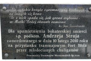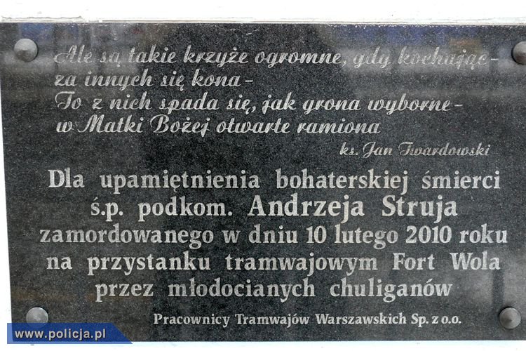 Przypomnijmy: Do tragicznego zdarzenia doszło 10 lutego 2010 roku na warszawskiej Woli. Kiedy na przystanek podjechał tramwaj, jeden ze stojących przy wiacie mężczyzn, rzucił koszem na śmieci w wagon. Na takie zachowanie natychmiast zareagował wychodzący z tramwaju pasażer. Był nim mł. asp. Andrzej Struj. Policjant został zaatakowany przez napastnika i zraniony nożem. Na miejsce natychmiast wezwano karetkę pogotowia i Policję. Mimo błyskawicznie udzielonej pomocy medycznej, 42-letni Andrzej Struj zmarł w szpitalu. Pośmiertnie został awansowany do stopnia podkomisarza Policji.