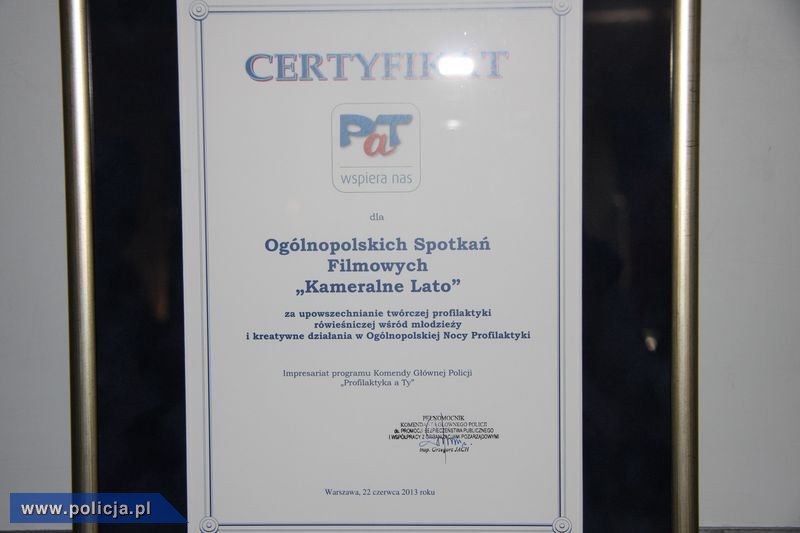 W Radomiu trwają Ogólnopolskie Spotkania Filmowe "Kameralne Lato". Jednym z istotnych punktów programu tej imprezy jest konferencja pn. "Społeczna i prewencyjna rola kultury". W jej trakcie dyrektor artystyczna festiwalu Anna Wróblewska odebrała z rąk insp. Grzegorza Jacha z Komendy Głównej Policji certyfikat "Wspiera nas PaT", przyznany dla tego wydarzenia kulturalnego.