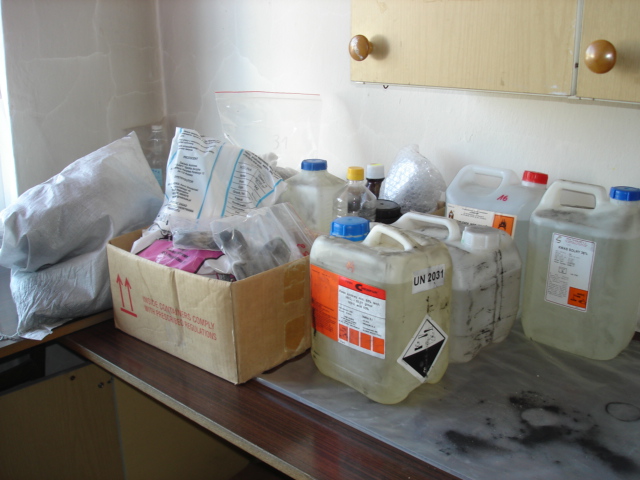W dwóch pomieszczeniach były cztery plastikowe pojemniki, każdy o pojemności 1.000 litrów, w których było 350 litrów bezbarwnej cieczy o wyraźnym zapachu alkoholu. Funkcjonariusze zabezpieczyli również urządzenia służące do odkażania rozcieńczalnika takie jak pompy, filtry i środki chemiczne, a także wiele plastikowych butelek i nakrętek.