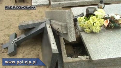 Policjanci z Legnicy zatrzymali trzy osoby podejrzane o zniszczenie nagrobków na cmentarzu komunalnym. 25 grudnia 2013 roku w godzinach porannych funkcjonariusze zostali powiadomieni przez pracownika ochrony, że na cmentarzu komunalnym nieznani sprawcy zdewastowali nagrobki. Policjanci stwierdzili na miejscu łącznie 22 uszkodzone nagrobki, których płyty były poprzewracane i popękane. Złamane były także trzy drewniane krzyże.