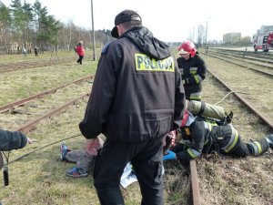 Dzisiaj (03.04.14) odbyły się ćwiczenia toruńskich służb. Krótko przed 10:00 na stacji kolejowej Toruń–Północ zatrzymał się pociąg. Z jego wnętrza wyskoczył zakrwawiony mężczyzna i ranny położył się na torach. Z pociągu w panice zaczęli wybiegać pasażerowie. Świadkowie powiadomili o tym służby ratunkowe i te odpowiedzialne za bezpieczeństwo. Pierwsza na miejsce dojechała Policja. Mundurowi od razu zajęli się udzielaniem pomocy poszkodowanym. Potem ustalili, że ranny leżący na torach to nożownik, który zaatakował jednego z pasażerów, po czym wyskoczył z pociągu.