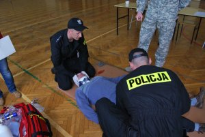 Zawody rozpoczęły się od testu pisemnego. Policjanci musieli wykazać się wiedzą teoretyczną z zakresu kwalifikowanej pierwszej pomocy. Każdy z zawodników miał odpowiedzieć na 30 pytań.