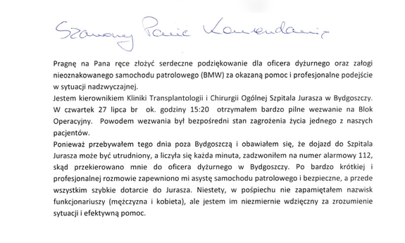 „Pragnę na Pana ręce złożyć serdeczne podziękowanie dla oficera dyżurnego oraz załogi nieoznakowanego samochodu patrolowego za okazaną pomoc i profesjonalne podejście w sytuacji nadzwyczajnej”. Tym słowami zwrócił się do Komendanta Wojewódzkiego Policji w Bydgoszczy Pan profesor - Kierownik Kliniki Transplantologii i Chirurgii Ogólnej Szpitala Uniwersyteckiego nr 1 w Bydgoszczy. Dzięki funkcjonariuszom, potrzebujący pilnej pomocy pacjent otrzymał ją w porę.