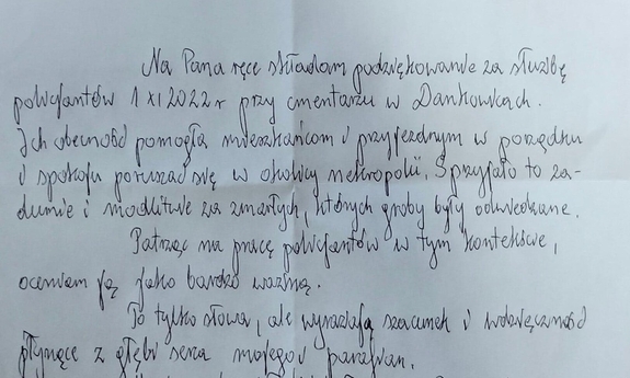 „Na Pana ręce składam podziękowania za służbę policjantów 1 XI 2022 roku przy cmentarzu w Dankowicach. Ich obecność pomogła mieszkańcom i przyjezdnym w porządku i spokoju poruszać się w okolicy nekropolii. Sprzyjało to zadumie i modlitwie za zmarłych, których groby były odwiedzane” tymi słowami ks. Waldemar Masłowski podziękował za zaangażowanie z jakim funkcjonariusze Komendy Powiatowej Policji w Strzelinie pełnili służbę w Dniu Wszystkich Świętych.