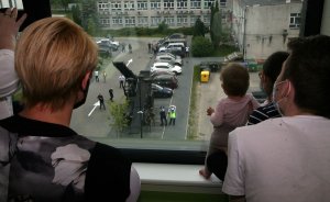 A że wyszliśmy z założenia, że uśmiech na twarzy dzieci powinien gościć codziennie, na przyszpitalnym parkingu zaparkował policyjny pojazd specjalistyczny do zadań specjalnych, czyli olbrzymi TUR z wysięgnikiem. To był dopiero początek atrakcji, które czekały na małych pacjentów przebywających na szpitalnych oddziałach Dziecięcego Szpitala Klinicznego im. Polikarpa Brudzińskiego w Warszawie. Chwilę później pojawiły się policyjne maskotki ze stołecznej komendy – dwa Borsuki, które z radością pozowały do zdjęć i machały do dzieci tłumnie zgromadzonych w oknach szpitala.