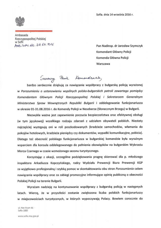 Podziękowania dla polskiej policji za nawiązanie współpracy z policją bułgarską - Podziękowania -