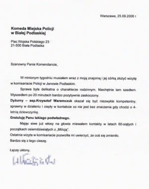 Powrót Drukuj Dla asp. Krzysztofa Waremczuka z KP w Janowie Podlaskim Jeżeli chcesz podziękować policjantom napisz.