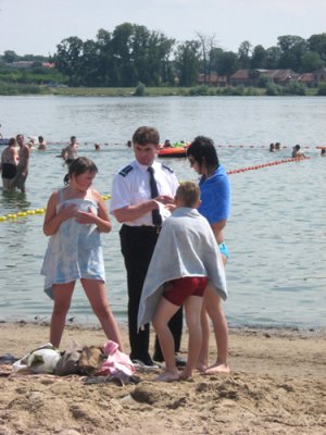 Wydział Prewencji mazowieckiej Policji wspólnie z Wydziałem Edukacji, Sportu i Turystyki Urzędu Miejskiego w Radomiu, Starostwem Powiatowym w Przysusze, Komendą Miejską Państwowej Straży Pożarnej w Radomiu, radomskim Wodnym Ochotniczym Pogotowiem Ratunkowym oraz radomskim Środowiskowo-Lekarskim Wodnym Ochotniczym Pogotowiem Ratunkowym zorganizowali już po raz drugi na plaży nad zalewem w Domaniowie pokaz instruktażowy dla dzieci, młodzieży i dorosłych poświęcony bezpieczeństwu podczas letniego wypoczynku.
