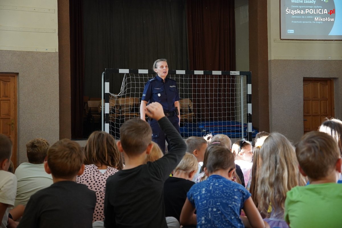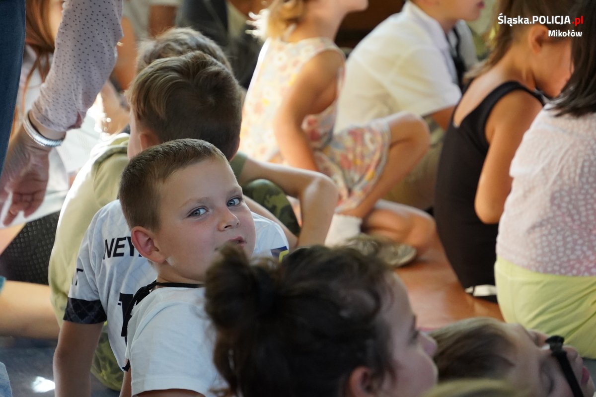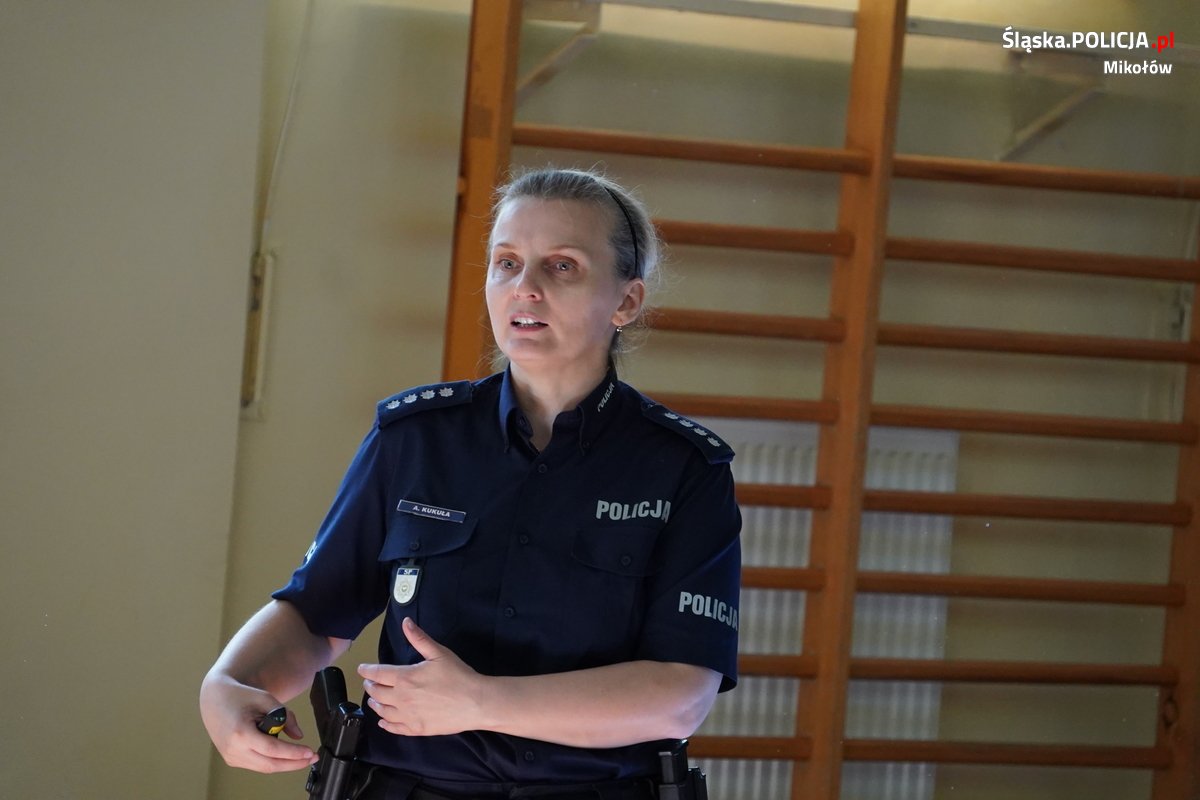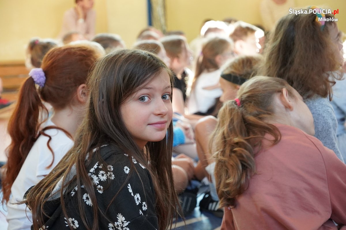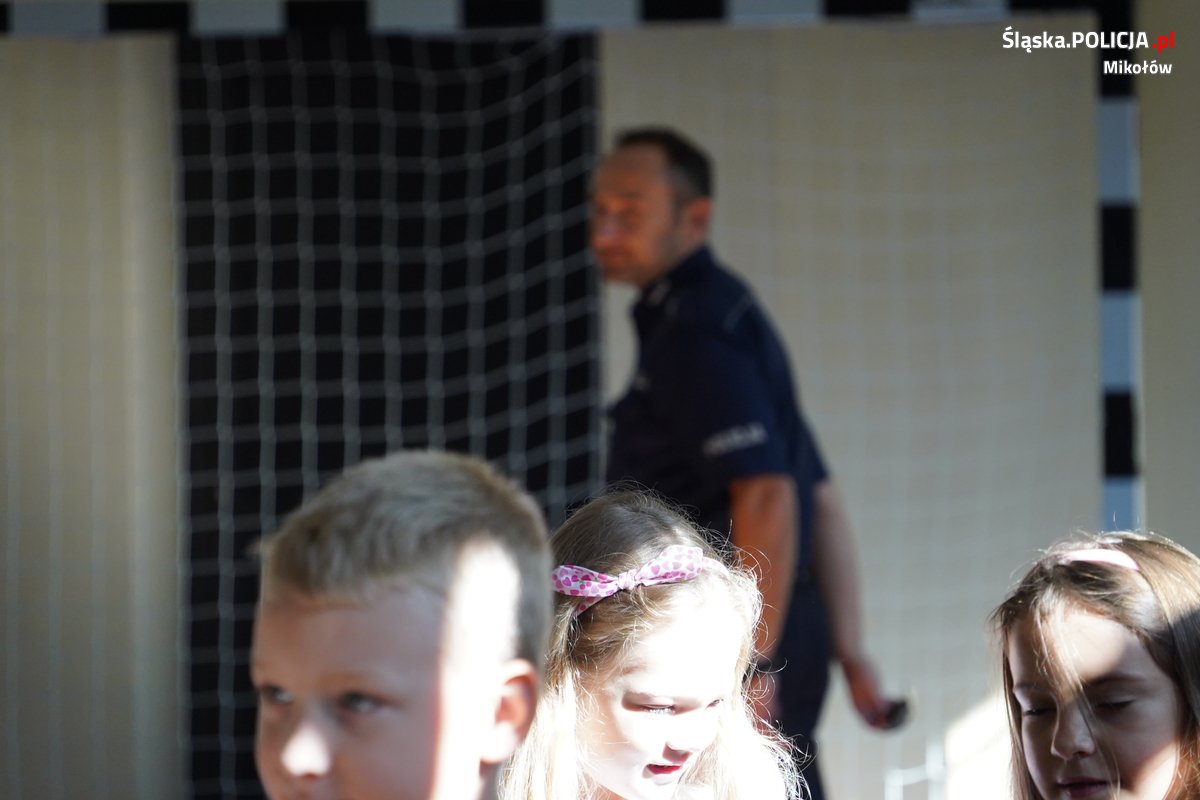 Wizyta w mikołowskiej podstawówce podczas działań profilaktycznych, to element stałej współpracy Komendy Powiatowej Policji w Mikołowie ze Szkołą Policji w Katowicach.
